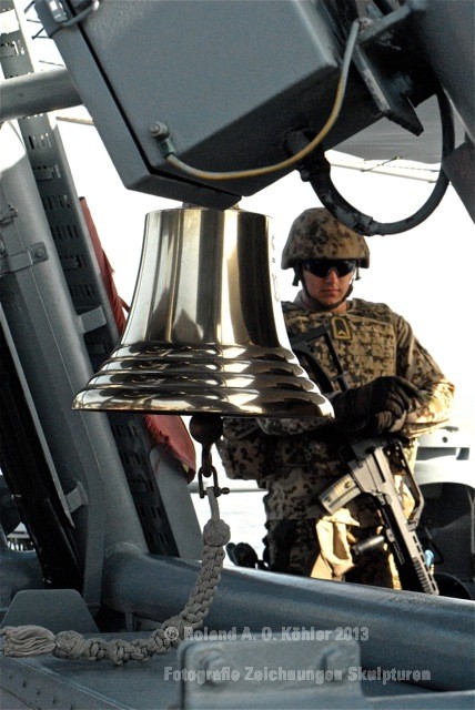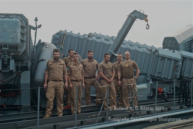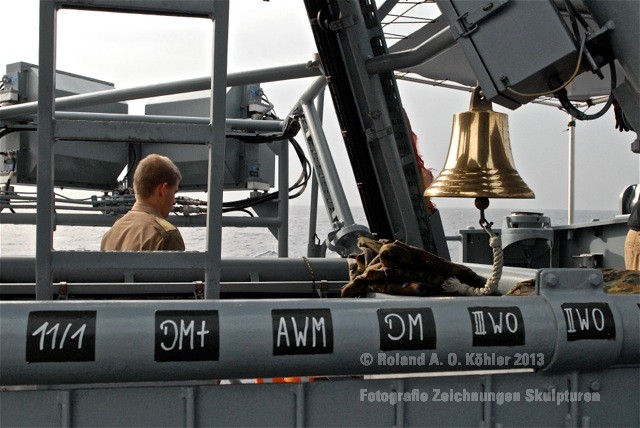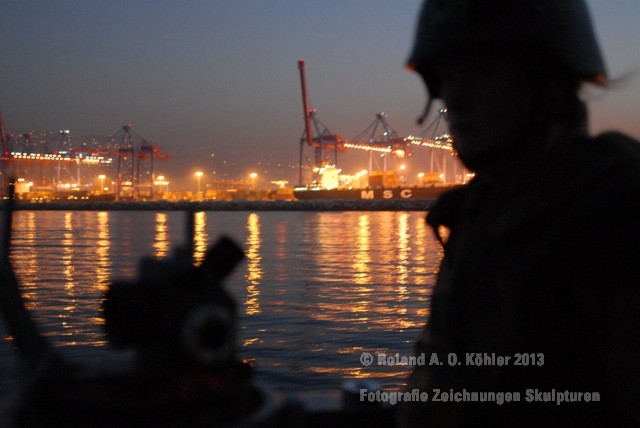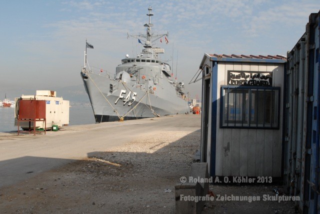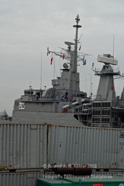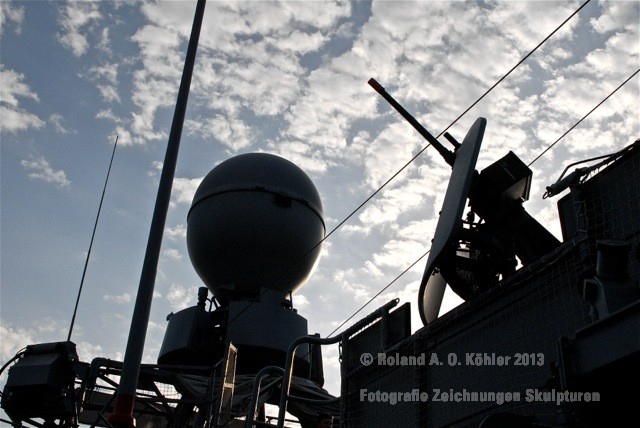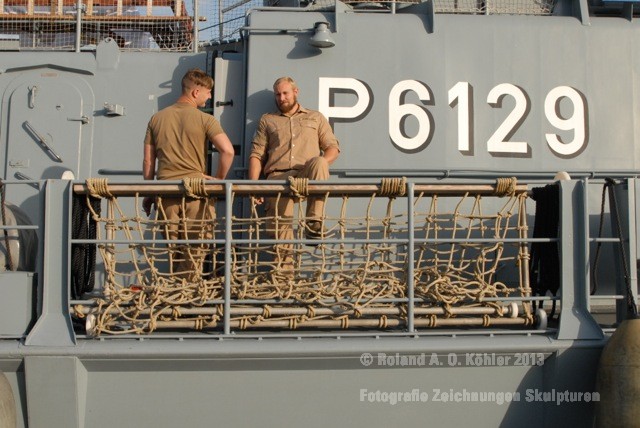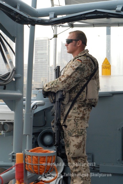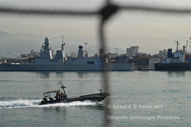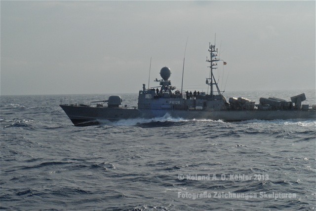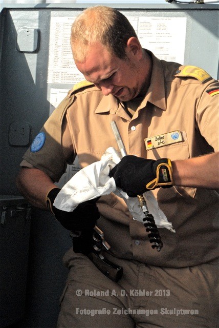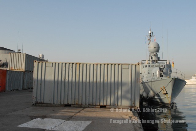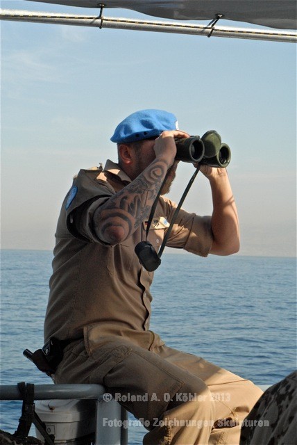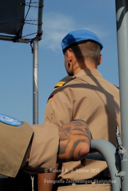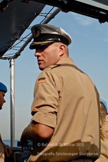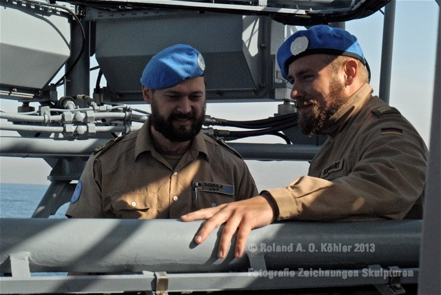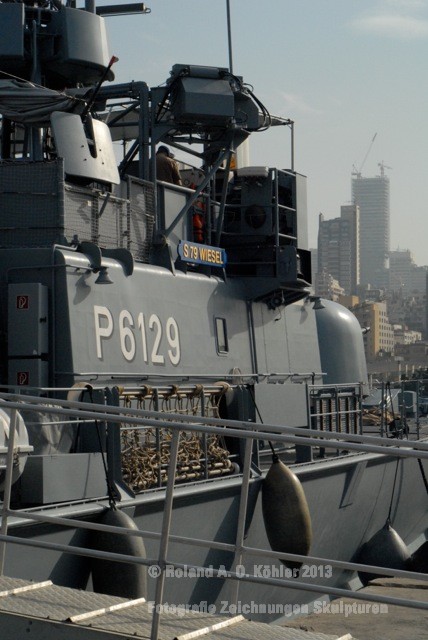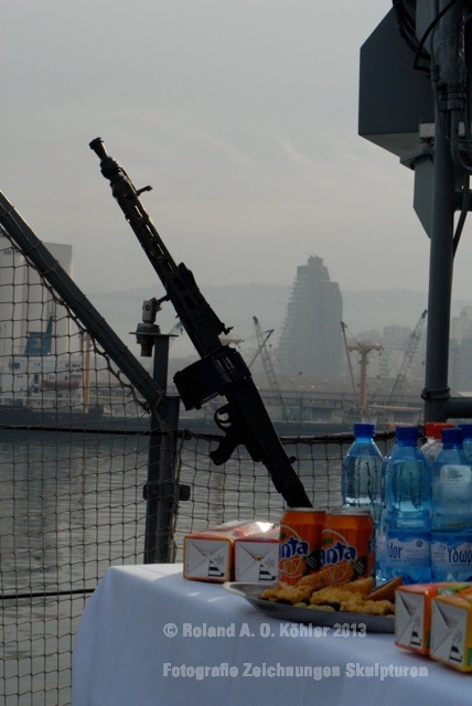 Am 3. Dezember ging ich im militärischen Teil des Beiruter Hafens an Bord des Schnellboots Wiesel. Weihnachten schien weit entfernt. Die Lufttemperatur war fast spätsommerlich. Über der gleißenden Wasseroberfläche schwebte der Geist der Levante. An der Pier lag still der Wiesel. Das Schnellboot sollte für die kommenden 15 Stunden mein Arbeitsplatz sein. Vorher wurde jedoch noch ein diplomatisch, hochrangiger Akt begangen. Staatssekretär Kossendey, Admiral Jbaily sowie der brasilianische Fregattenkapitän Bazzi beantworteten Fragen zu bilateralen Beziehungen vor Medienvertretern auf dem B -Deck. Zwischen Softdrinks und Selbstgebackenem vergaß man fast, dass man sich an Bord eines Kriegsschiffes im Krisengebiet befand.