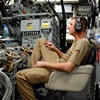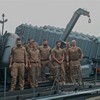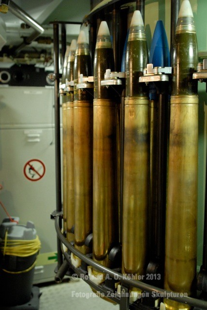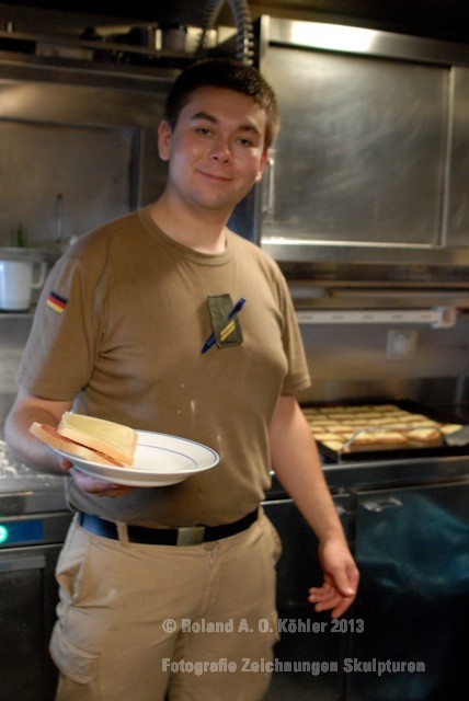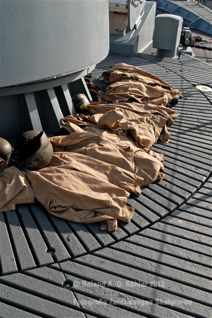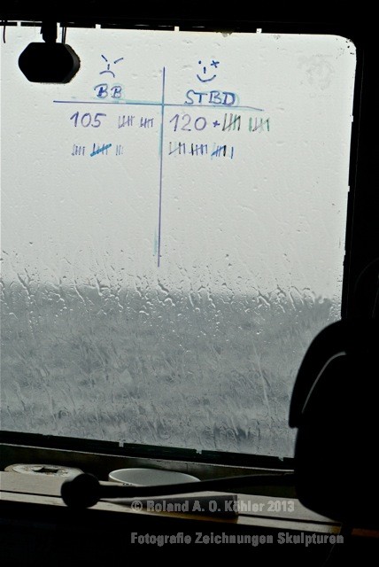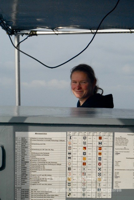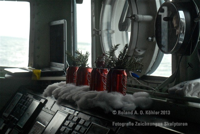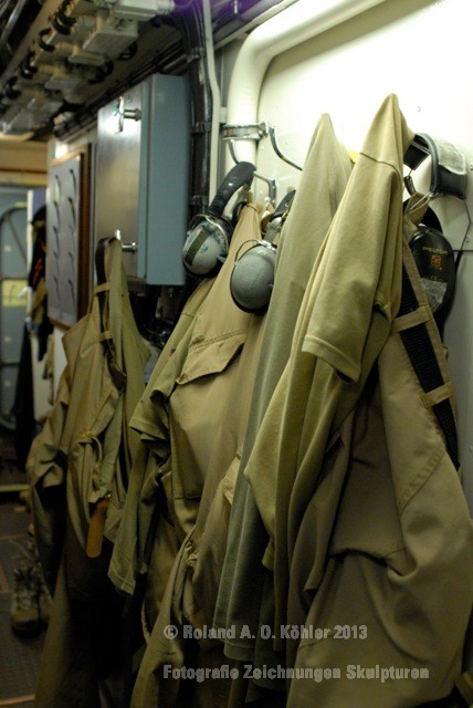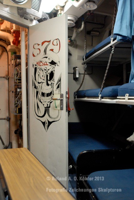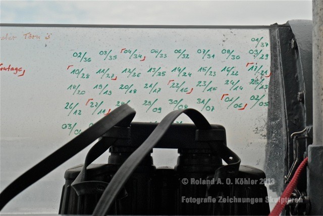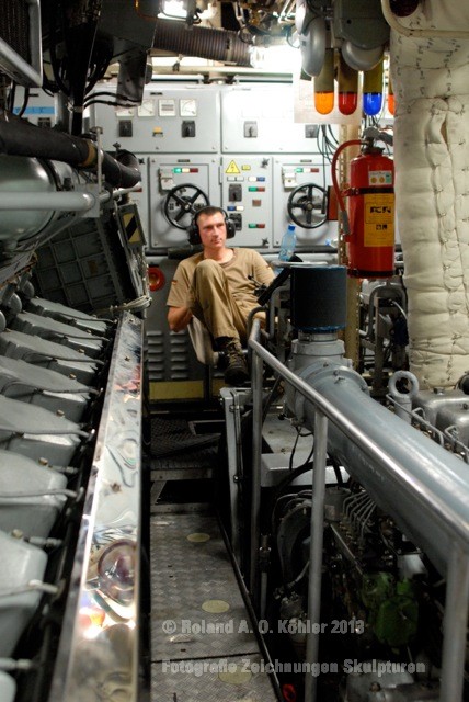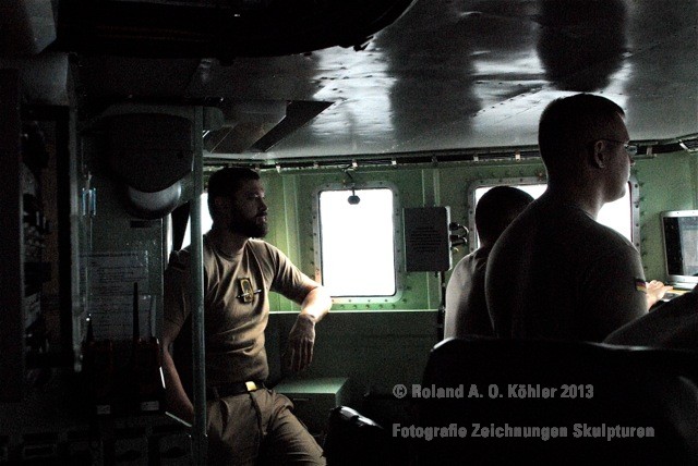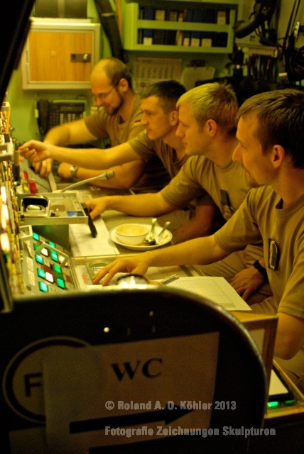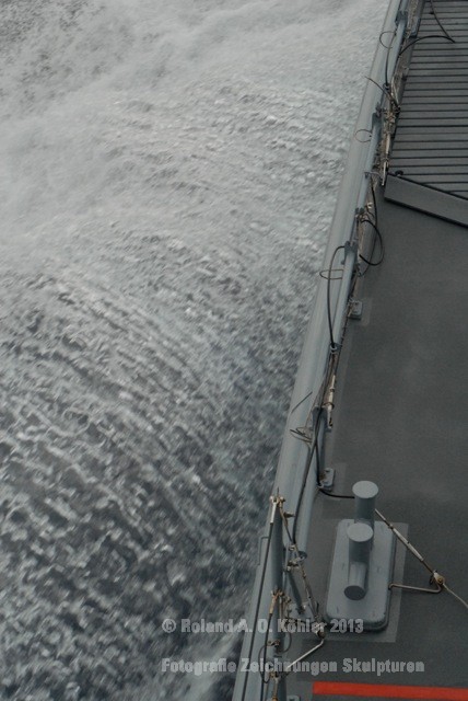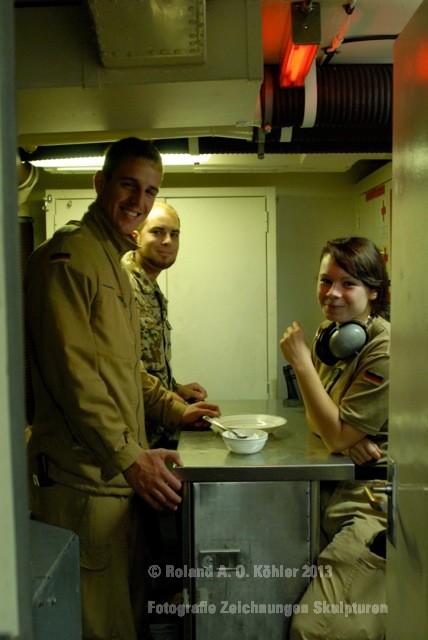 Die Nacht verbrachte ich in einer Kammer Unterdeck im Heck. U-Bootflair. Auf dem Gang lagen in geordnetem Chaos Seestiefel. An jedem verfügbaren Haken hingen Jacken und Uniformhosen. Geschlafen wird im Schichtbetrieb. Aufstehen geschieht fast geräuschlos. Die Crew bewegte sich schlafwandlerisch mit Mickeymäusen geschützt durch den Maschinenraum Richtung Frühstücksausgabe. Im Maschinenraum leben die Heizer mit 18 000 PS Motorkraft als Kompagnon. Das Frühstück wird wie alle anderen Mahlzeiten stehend eigenommen. Danach sucht jeder an Bord seinen ihm zugewiesenen Bereich auf.