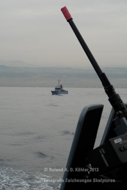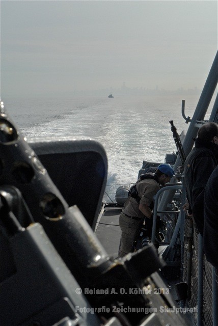 Am späten Nachmittag liefen wir aus. Die Reise ging jedoch erst noch in unser Einsatzgebiet, ein genau definierter Bereich vor der libanesischen Küste. Hier cruiste der Wiesel bis in den kommenden Vormittag hinein. Aufgabe war die Observation von verdächtigen Wasserfahrzeugen und ein mögliches Hailing (Kontrolle).